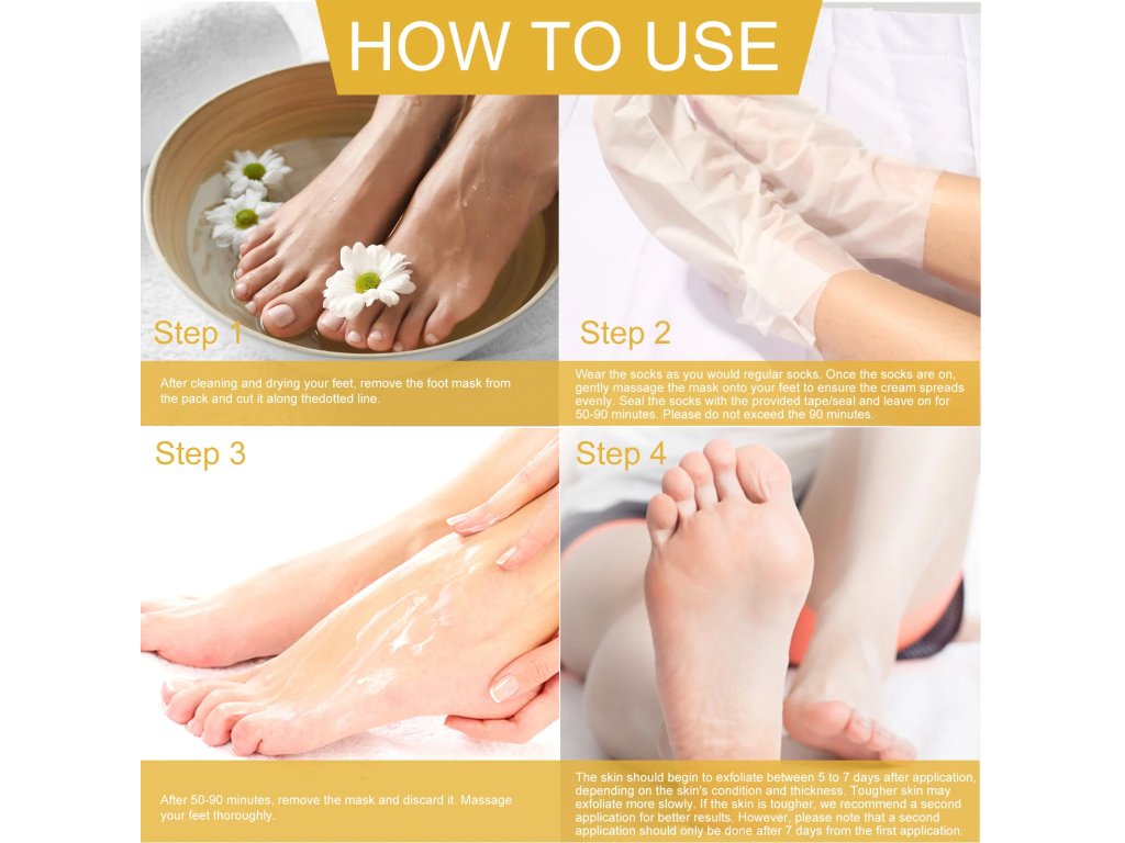Usage is simple: Just put on the mask, let it work for 50–60 minutes, and then wash your feet. Within a few days, the dead skin will start to peel off, revealing fresh and renewed skin.