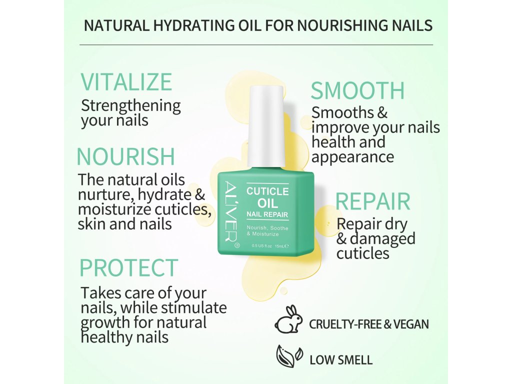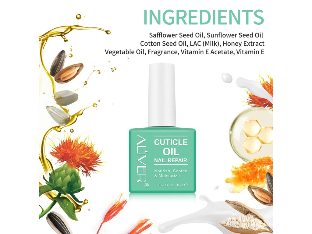 Give your nails and cuticles perfect care with Aliver Cuticle Oil. This nourishing oil is enriched with natural ingredients such as safflower seed oil, sunflower oil, cottonseed oil, vitamin E, and honey extract. It gently hydrates and nourishes your cuticles, preventing dryness and cracking. The oil is ideal for daily use, keeping your nails and cuticles healthy, flexible, and well-groomed.