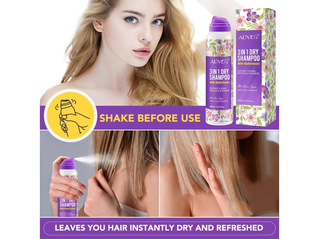 Aliver 3v1 Dry Shampoo je vysoko účinný suchý šampón, ktorý okamžite čistí, revitalizuje a hydratuje vlasy – bez potreby vody. Vďaka obsahu prírodných zložiek ako je ryžový škrob, rakytník, avokádo a argánový olej, vlasy vyzerajú sviežo, sú nadýchané a zdravé. Vhodný na každodenné použitie, keď potrebujete rýchlo osviežiť účes a dodať vlasom objem a lesk.